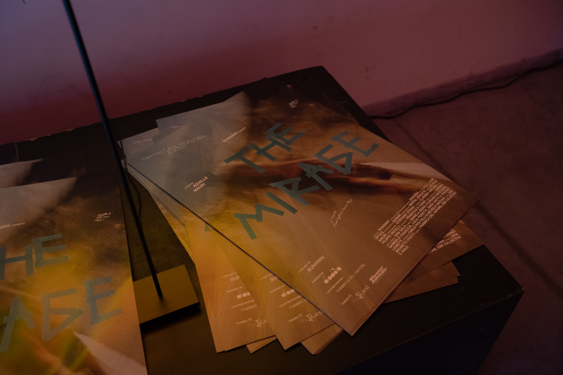 In the heart of a relentless desert, where the scorching sun hugs the endless horizon and the day surrenders to darkness, a mystical journey begins. A 548-kilometre odyssey from Santa Monica to Las Vegas that transcends all rules, defies all expectations and surpasses the boundaries of the possible. A select few runners, no spectators: a challenge for only those with the courage to push their limits. Starting from the /mi-rage/ concept, an optical phenomenon that can trick the mind into perceiving something that appears to be near, but is actually far away, or non-existent, I had the pleasure to design the visual identity of the documentary using a hand-made typography for the main title (assembling it with runner tape) and all the collaterals: the official poster, social media contents, graphic super for the documentary and end titles.