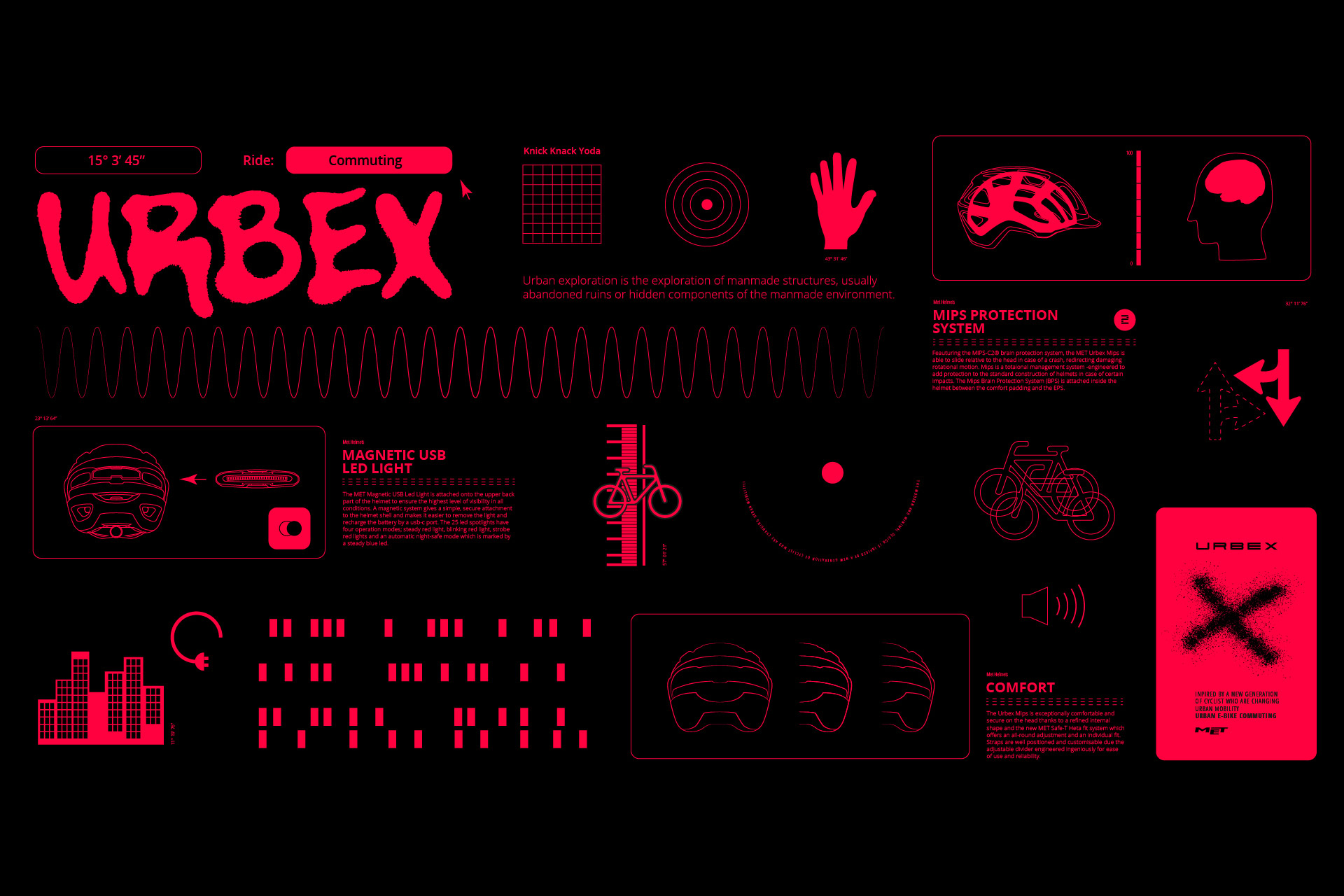 Together with the MET Helmets team, I designed the visual identity and assets for the new Urbex campaign. The modern and minimal design of this new helmet is inspired by a new generation of cyclists who are changing urban mobility. Made safer by NTA certification, the Urbex is fully equipped with features that ensure comfort, visibility and ease of use. For the campaign we collaborated with Matéo Montero aka Rawance, French DJ and owner of a Rome-based record label, to hit a young and dynamic target. The whole identity wants to inspire and attract a new generation of cyclists, reminding them to always wear a helmet. I chose an identifying red color based on the rear lights of the cars, enhancing their movement.